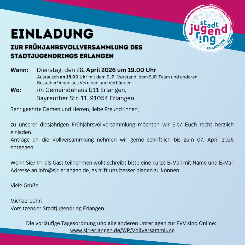 Der Stadtjugendring Erlangen (SJR) ist die Arbeitsgemeinschaft der Erlanger Jugendverbände und Gemeinschaften. Als Gliederung des Bayerischen Jugendringes übernehmen wir Aufgaben der Jugendarbeit, indem wir zum Beispiel die Erlanger Jugendverbände unterstützen und finanziell fördern, Programme für Kinder und Jugendliche organisieren oder in Entscheidungsgremien mitwirken, wenn es um Themen zur Jugend in Erlangen geht.