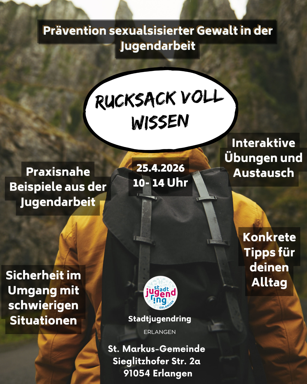 St. Markus Gemeinde Sieglitzhofer Str. 2a, ErlangenWarum dabei sein? Du engagierst dich in der Kinder- oder Jugendarbeit? Dann ist diese Schulung genau richtig für dich. Du lernst, wie du Verantwortung übernehmen, Grenzen erkennen und Kinder sowie Jugendliche wirksam schützen kannst. Was dich erwartet Praxisnahe Beispiele aus der Jugendarbeit • Interaktive Übungen und Austausch • Sicherheit im Umgang mit schwierigen Situationen • […]